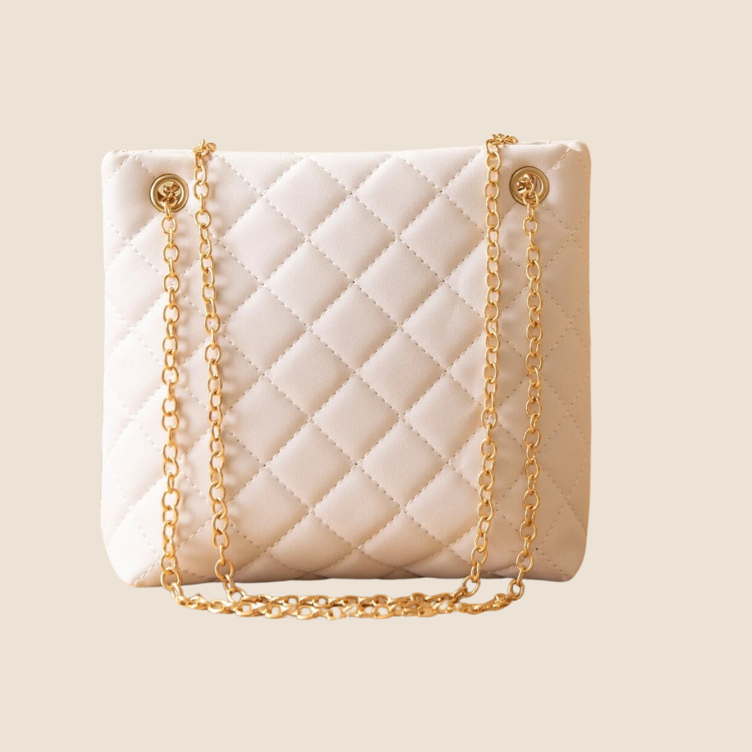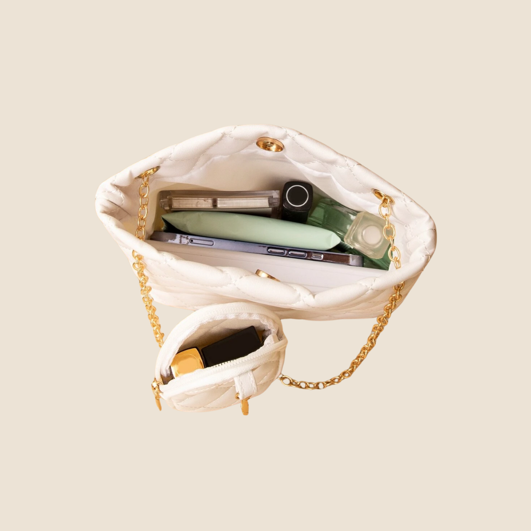 Stijlvolle 2-delige dames tas-set met een luxe gewatteerd design. De set bestaat uit een schoudertas en een klein bijpassend tasje. Beide tassen hebben een zachte crème-witte kleur en goudkleurige kettingdetails. Perfect voor dagelijks gebruik en ideaal om je essentials overzichtelijk mee te nemen. product 2-delige Dames Schoudertas Set
